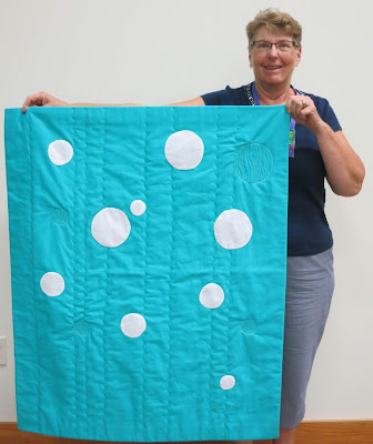 #13 - Gwen @flaquiltz used the 2019 Kona Color of the Year, Splash, as background for this 42" X 60" quilt that was inspired by a lit wall and lit swimming pool at an Orlando hotel. She quilted circles, and a serpentine stitch on her Bernina 750.
